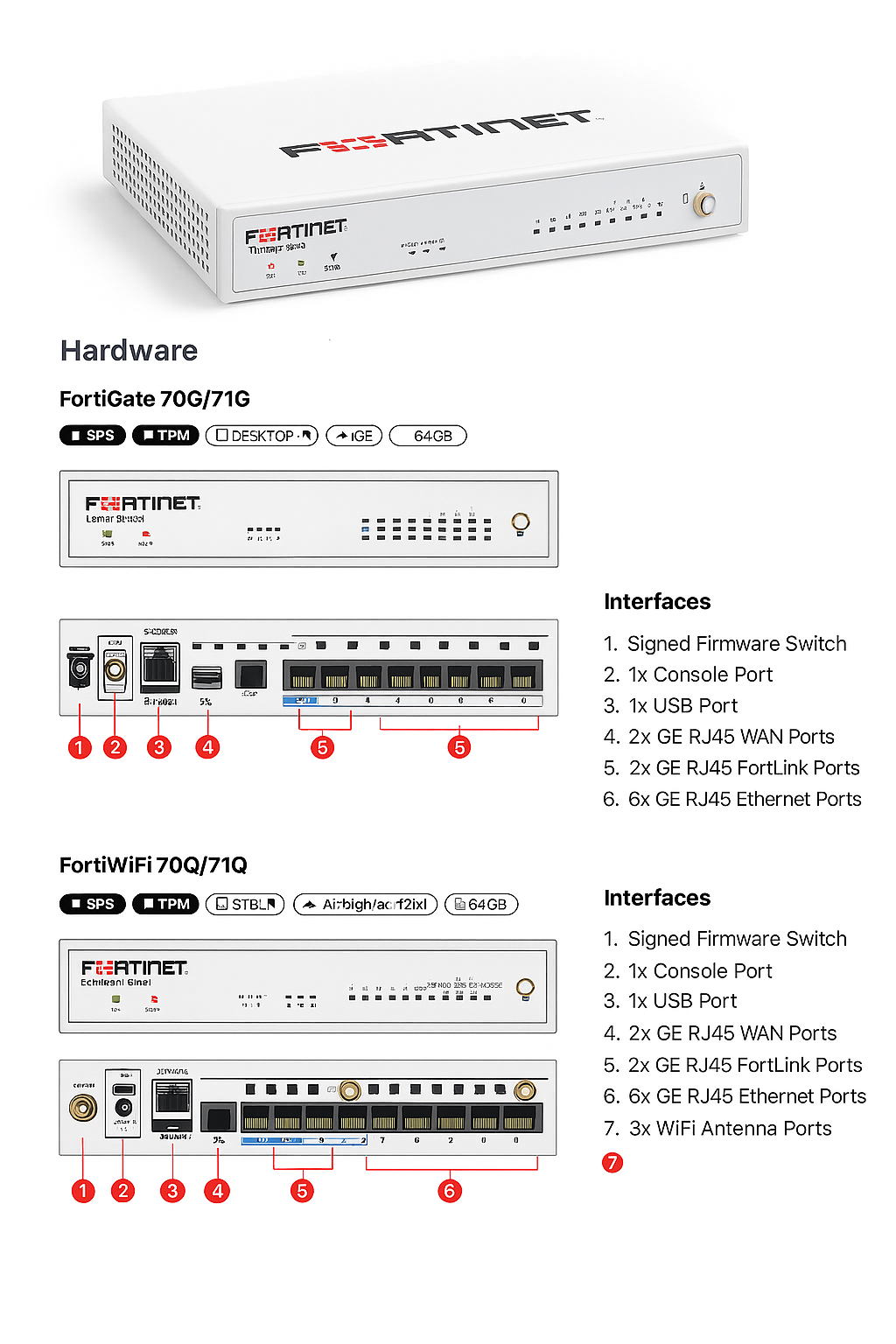 La serie FortiGate y FortiWiFi 70G integra funciones de firewall, SD-WAN y seguridad en un solo dispositivo, lo que las convierte en la solución perfecta para construir redes seguras en sedes empresariales distribuidas y transformar la arquitectura WAN a cualquier escala.